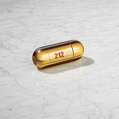 El frasco del perfume 212 VIP representa el puro objeto de deseo, el encanto del brillo dorado que aporta luz al producto. Curvas femeninas y atractivas. Detalle para la tapa magnética.